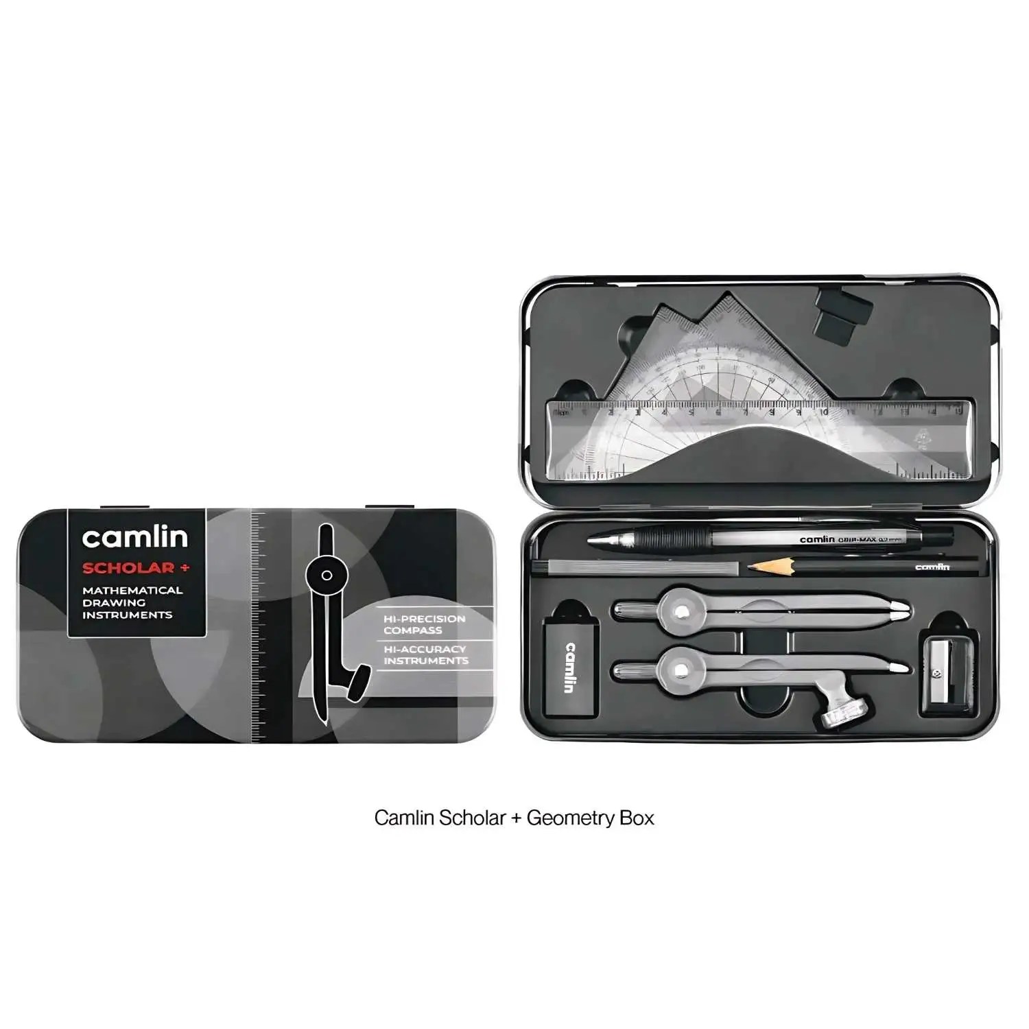 The Scholar + Geometry Box is designed with a compact form factor, making it ideal for school bags and regular classroom use. Packed in a stylish metal tin, this set includes a hi-precision compass and divider, a Camlin 0.5 mm mechanical pencil, extra lead, an eraser, sharpener, 15 cm ruler, set squares, and a protractor.