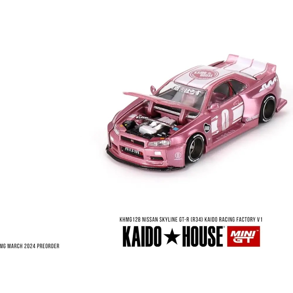 The Kaido House Mini GT Nissan Skyline GT-R R34 is a must-have collectible for diecast car enthusiasts and JDM lovers. This detailed scale model represents the iconic R34 GT-R, a car that has become a legend in motorsport history and tuner culture. Designed in collaboration with Kaido House, the model features the Kaido Racing Factory V1 body kit, giving it an aggressive stance and authentic race-inspired details. The metallic pink paint finish with racing graphics adds uniqueness and makes it stand out in any diecast collection.