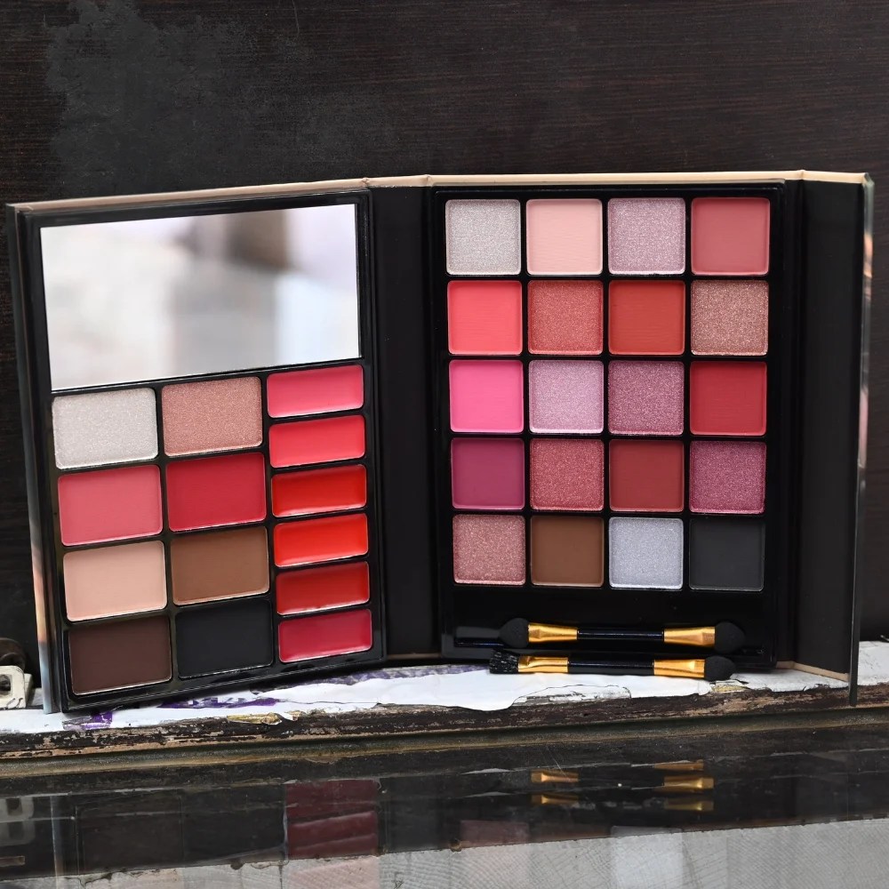 Along with eyeshadows the palette includes creamy and highly pigmented lip shades. You get multiple color options such as nude pink bright red deep plum and coral tones that are perfect for any occasion. The palette also features a bright highlighter for a glowing finish a soft blusher for natural radiance and eyebrow powders for shaping and defining brows.