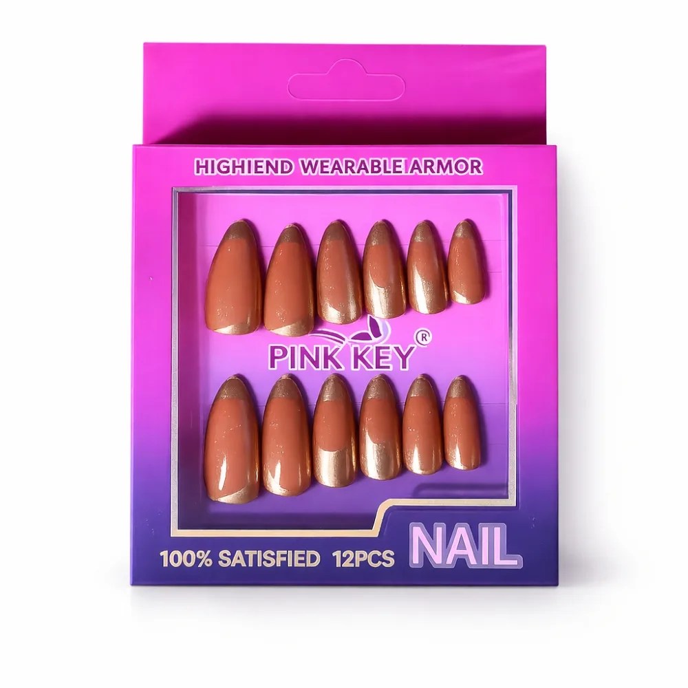 pink key nails, press on nails, artificial nails, fake nails for women, nude press on nails, brown press on nails, french tip nails, gold tip nails, reusable nails, almond shape nails, glossy press on nails, nail extension set, ready to wear nails, premium artificial nails, nail art press on, stick on nails, salon nails at home, party wear nails, bridal press on nails, 12 pcs nail set